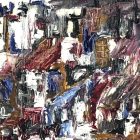 A Mid 20th Century modernist abstract oil painting, in textured brushstrokes of predominantly maroon, blue, and white with pops of tangerine.