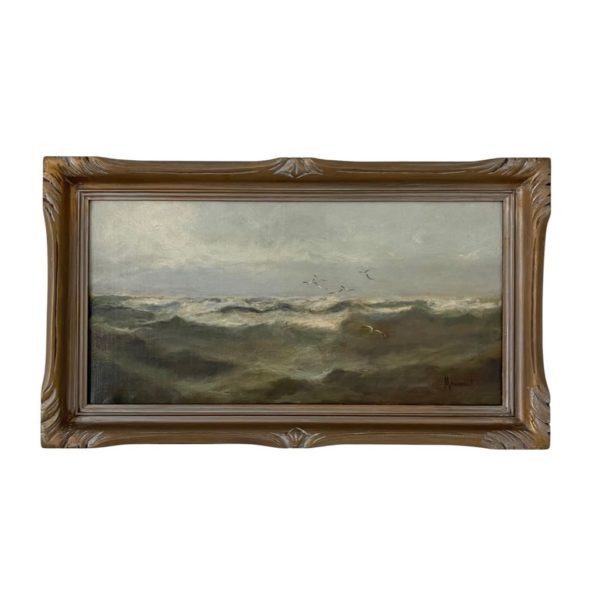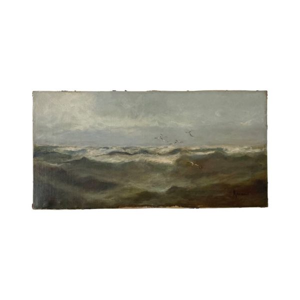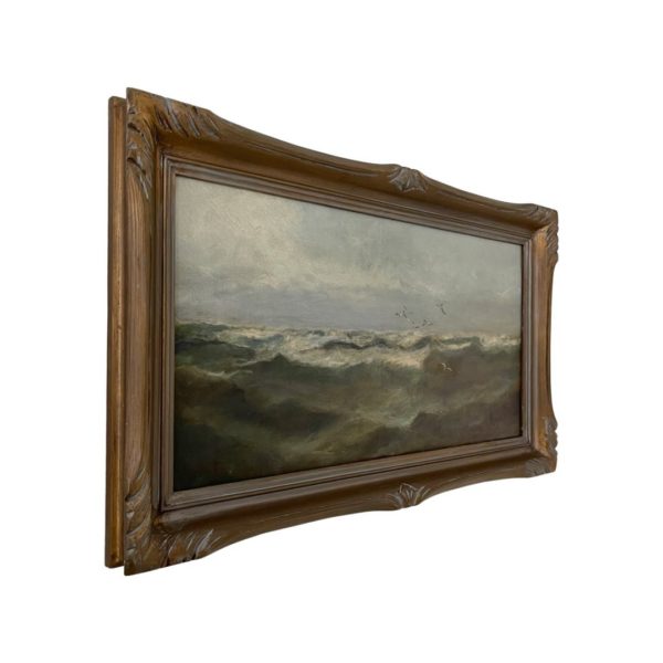 A dramatic large scale antique c1900 Seascape of crashing waves and swirling gulls; painted in deep moody oceanic tones.