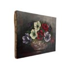 A beautifully vibrant antique c1910 Still Life of mixed Anemones, collected in a woven basket upon a dark ground.